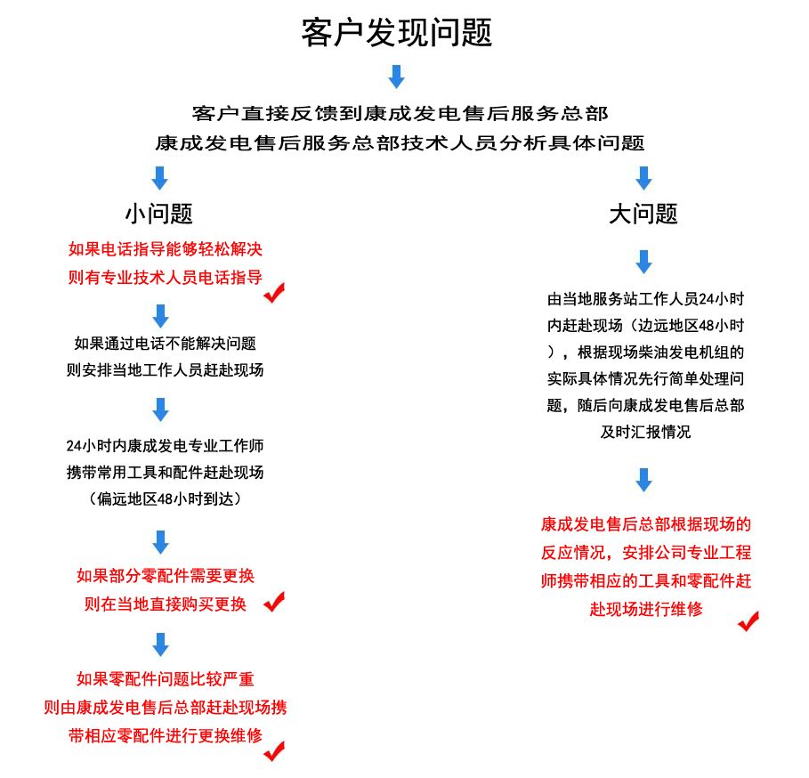 2、故障維修在收到用戶維修通知時,該通知應是傳真函件。售后服務部將在2小時內派出工程技術人員,24小時內抵達所要維修設備的地點(邊遠地區48小時應到達)。售后服務部將建立用戶的技術檔案,定期或不定期地咨詢、了解用戶設備的使用狀況,以便使您的柴油發電機組處在良好的備用狀態。每年定期或不定期的拜訪使用康成柴油發電機組的用戶,記錄用戶對我們售后服務部的意見以及良好的建議。